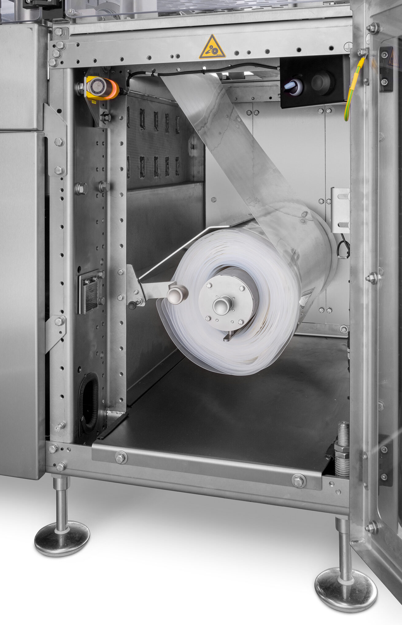 - Filmtransportsysteem – Een speciale klem-as houdt de rol aan de voorkant van de machine vast. Sensoren houden de status van de rol in de gaten, terwijl geleideplaten en rollen zorgen voor een soepel filmtransport.