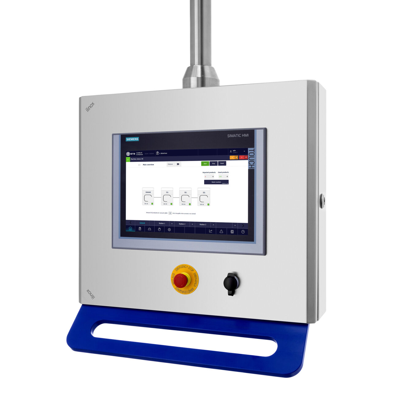 HMI op een draaiarm voor duidelijke procescontrole, receptselectie en gereedschapsbeheer. - Geïntegreerd veiligheidssysteem