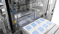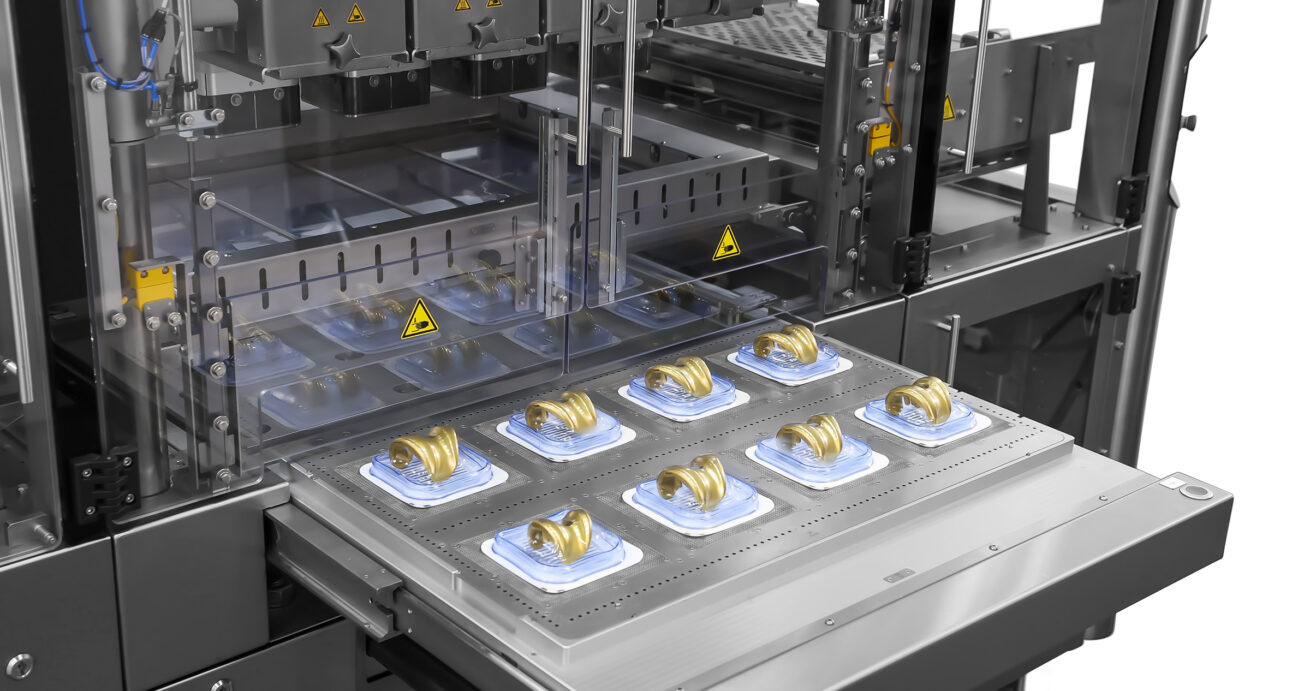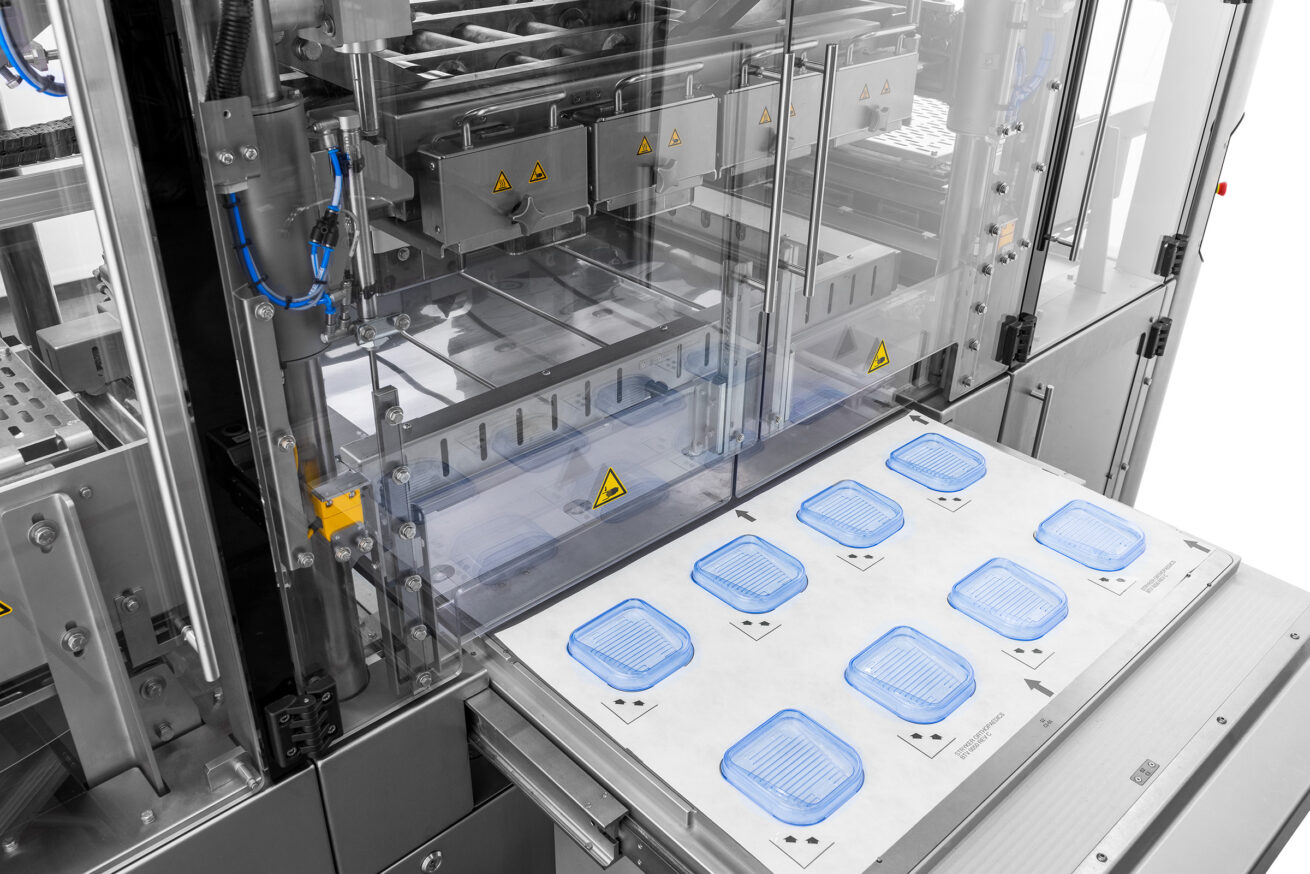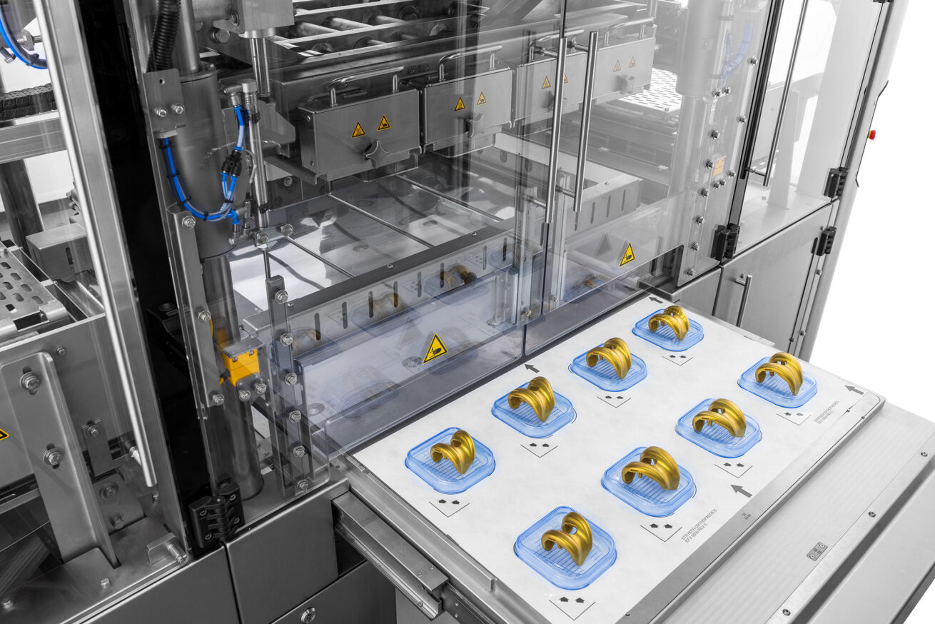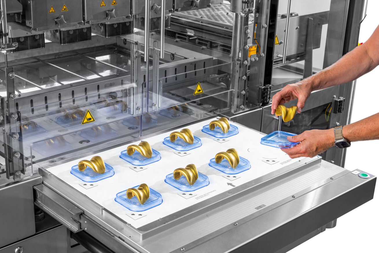De operator legt een Tyvek-vel op de lade, gevolgd door de blistertrays en de orthopedische implantaten. Na activering beweegt de lade automatisch naar de afgesloten kamer. Binnenin wordt de Surlyn-folie verwarmd en met behulp van vacuüm en het klemframe strak om de implantaten gevormd, waardoor een veilige afdichting met het Tyvek ontstaat. In het bovenste klemframe bevinden zich ook blaasmonden aan de linker- en rechterkant van het frame. Deze blaasmonden worden tijdens het skinpack-proces gebruikt om het bovenste deel van de Surlyn af te koelen en een betere skinpack-verpakking van de producten te creëren. Het gesealde vel wordt vervolgens in afzonderlijke blisters gesneden. Zodra de cyclus is voltooid, gaat de lade open en kan de operator de verpakte producten veilig verwijderen.